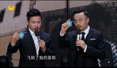 用实物图片表现节目中所谈论到的事物,尤其是鲜有人知的事物,的确是一种直观、便捷的方式,创意字幕的形式也十分有利于发挥这种方式的优势。本例中,主持人欧弟提到青鸟这一吉祥鸟时,用手势比划出了他所见到的青鸟的大小,另一主持人汪涵也跟着比划,都在强调青鸟的“小”。创意字幕所加入的图片按照他们比划出的大小,把“青鸟”放到了他们的手指间,并随着他们的手势上下“飞”动着,又仿佛是他们用两根手指“捏”住了一只青鸟,创意字幕除了向观众展示青鸟其物,还增加了图片的动感,使主持人的描述更加具象化。